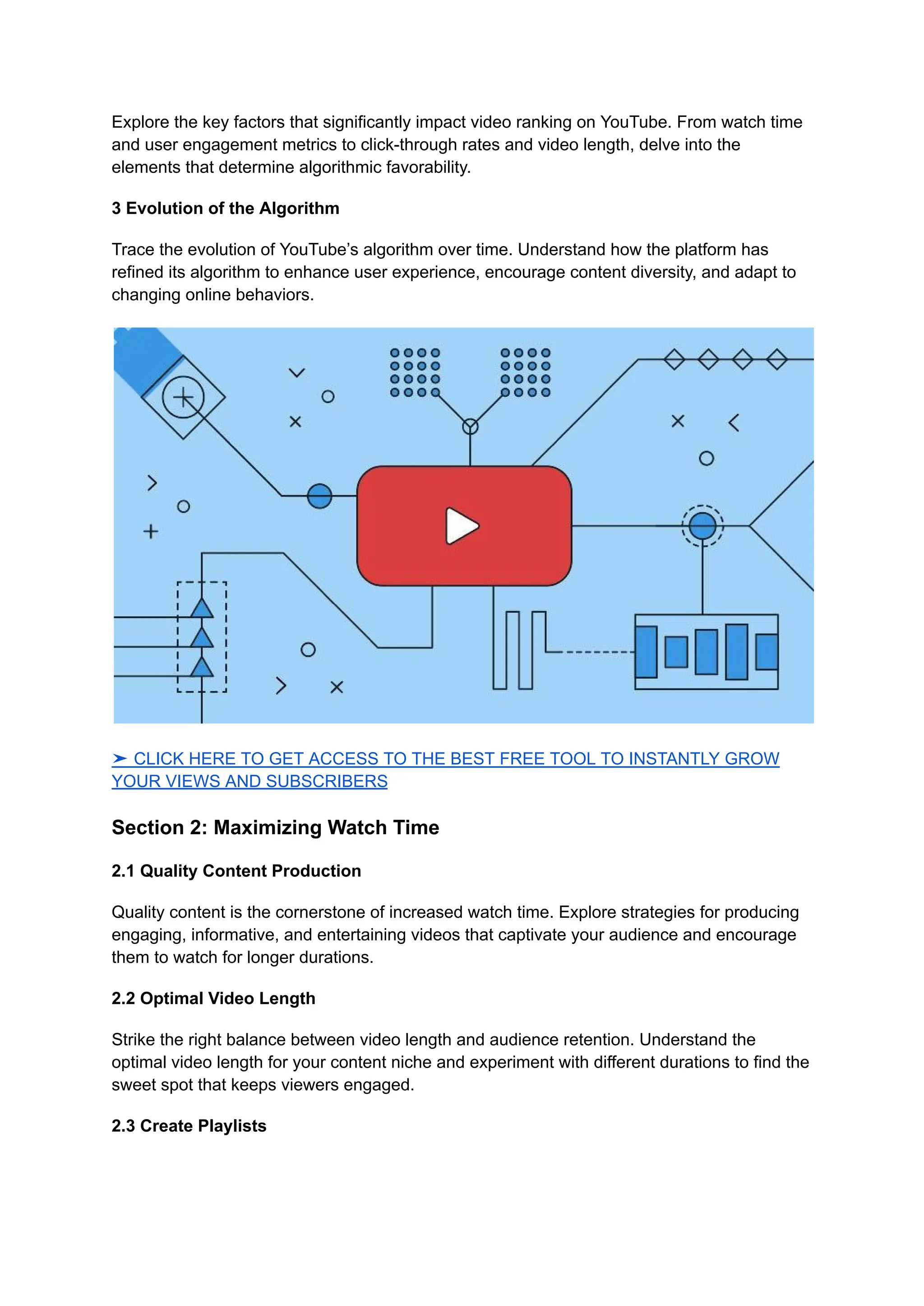 The document outlines strategies for navigating the YouTube algorithm to improve visibility and growth for content creators. Key topics include understanding the algorithm's mechanics, maximizing watch time, optimizing thumbnails and titles, engaging with viewers, and leveraging analytics. The guide emphasizes the importance of adapting to changes, continuous learning, and employing multiple monetization strategies.