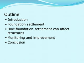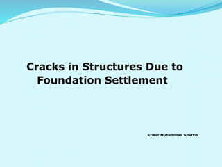 The document discusses cracks in structures due to foundation settlement. It outlines that foundation settlement can cause uniform or differential settlement, which can damage buildings. The settlement should be monitored using techniques like measuring crack width and building inclination changes. Soil improvement methods like grouting can also be used to reduce settlement. The conclusion states that foundation monitoring and improving site soil are important to prevent settlement from damaging buildings.