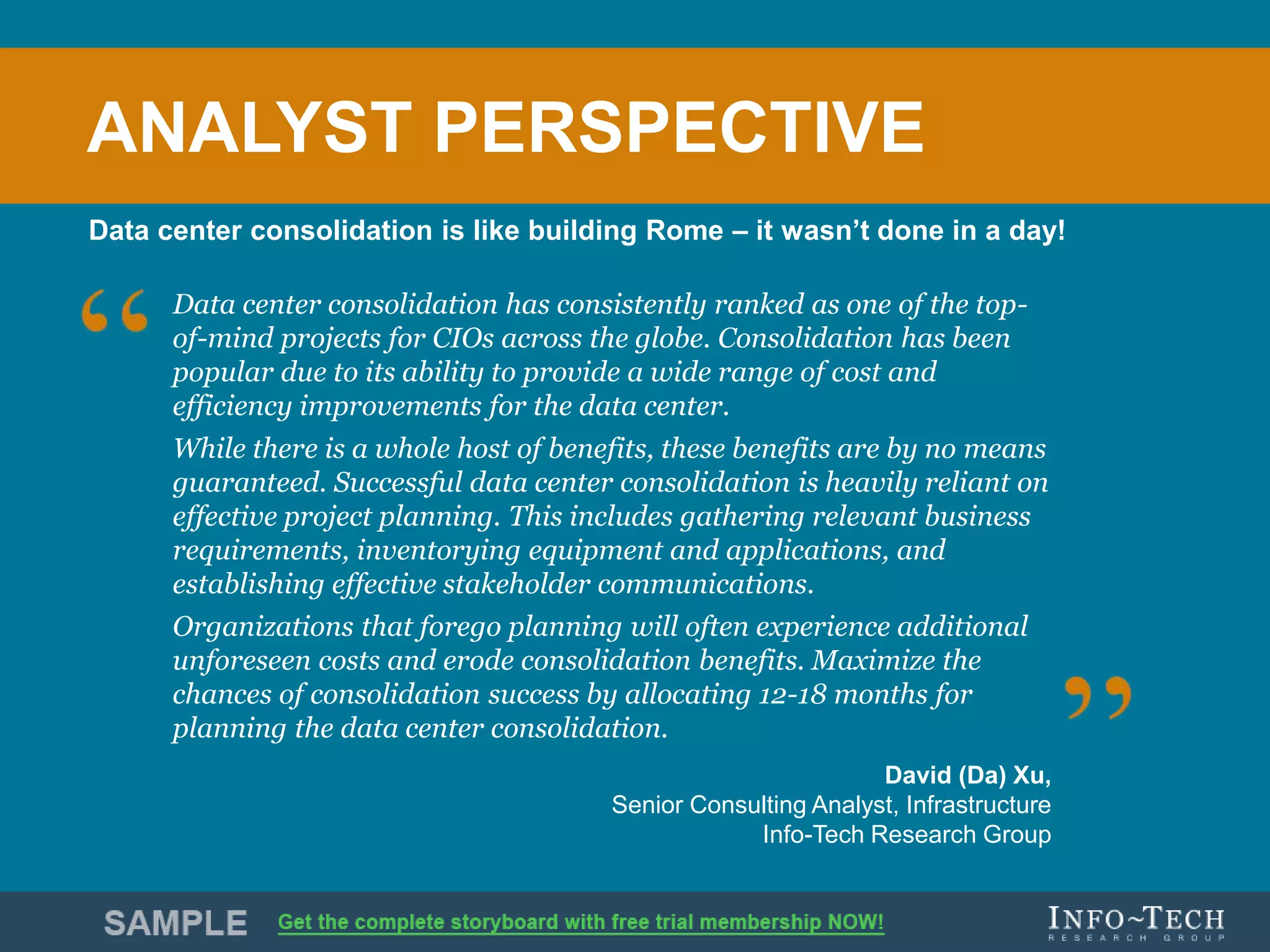 Info-Tech Research Group provides IT research and advice to help organizations address their full spectrum of IT concerns. The document discusses Info-Tech's services for data center consolidation, including actionable insights and templates to help plan and execute consolidation projects. It emphasizes that 12-18 months of planning is key to consolidation success in order to properly inventory equipment, address requirements, and mitigate risks and unexpected costs.
