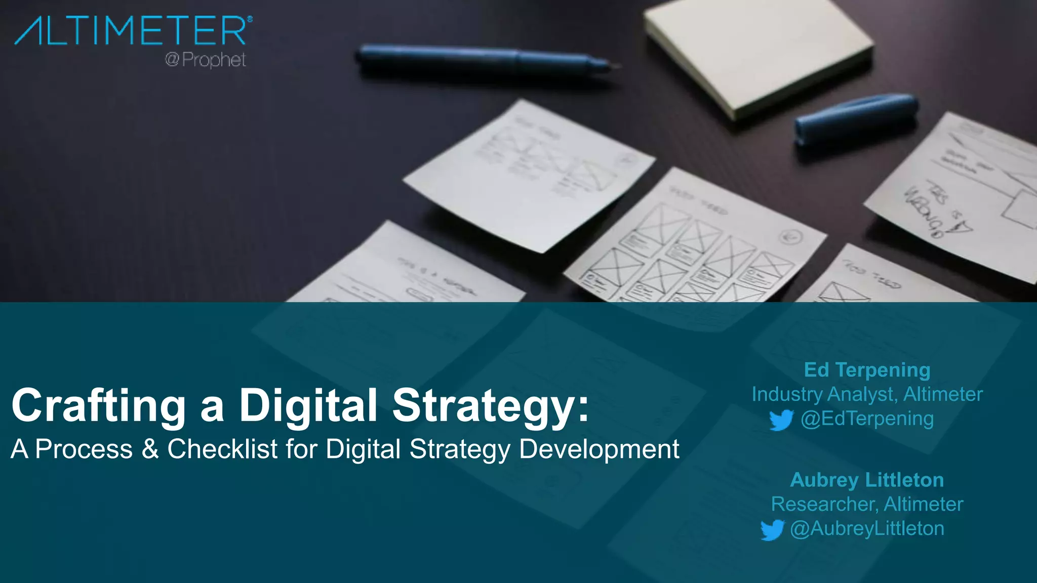 The document outlines a 7-step process for developing a digital strategy, addressing common barriers along the way. It begins with identifying external market forces and competitors driving the need for change. Next, it involves securing commitment from leadership and cross-functional teams. Formulating alternatives requires confronting truths, prioritizing opportunities, and ensuring technical readiness. The best strategies synthesize ideas into a coherent direction with governance and metrics. Finally, the vision must be socialized across the organization to gain support for execution. The process emphasizes collaboration, cultural change, and using data to inform strategic choices.