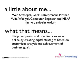 The document outlines principles for creating a successful social media strategy, emphasizing the importance of defining business goals, understanding your audience, and crafting relevant content. It discusses key steps such as identifying your base of operations, finding influencers, and measuring results to continually improve. Additionally, it highlights the author's expertise and offers resources for further learning.