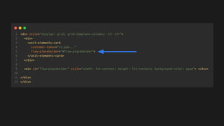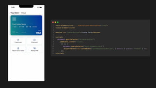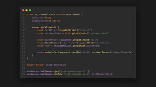 The document outlines the integration of third-party banking features through web components and React, emphasizing the importance of minimal coding and compatibility. It discusses the advantages of using web components such as encapsulation, fade-safe functionalities, and framework independence, while also addressing real-world applications and communication methods through event buses. Additionally, it explores themes of atomic design, theming, and performance while providing insights and takeaways for developers building client libraries.