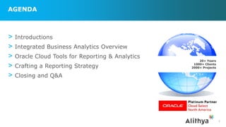 The document outlines a strategy for effective reporting and analytics using Oracle Cloud, highlighting the expertise of presenters Mike Killeen and Martin Veillette. Key challenges in reporting such as inefficiency and lack of insight are discussed, along with solutions leveraging Oracle's integrated business analytics tools. It emphasizes the importance of defining a reporting strategy that encompasses technology, people, and processes to drive better business performance.