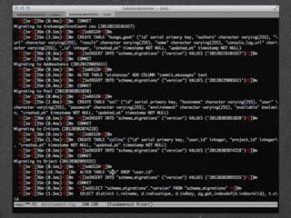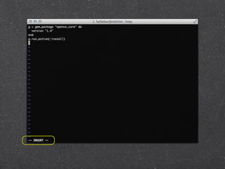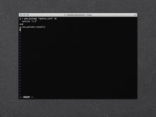 The document describes a presentation on crafting beautiful command line applications using Ruby. The presentation discusses why the command line is useful, what makes a good CLI app, and some key principles for CLI apps like least astonishment, reversibility, config files, graceful failure, and honoring piping. It also covers input/output in CLI apps and libraries like OptionParser, Mixlib::CLI, and Thor that can help build CLI apps in Ruby.