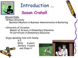 This document provides information about Mrs. Crahall's Kindergarten classroom. It introduces the teacher and her background and outlines the goals and expectations for students throughout the year, including developing independence, listening skills, and readiness for first grade. It also details classroom policies, homework, behavior management, rewards, special events, and provides a link for additional classroom information.