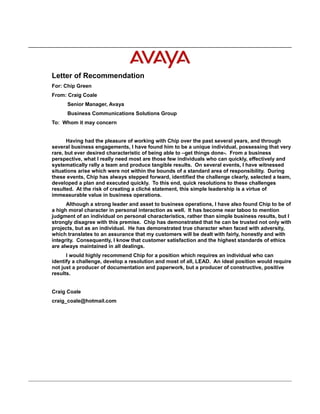 Craig Coale, a senior manager at Avaya, recommends Chip Green for positions requiring leadership. Coale describes Chip as able to quickly rally teams to produce tangible results by clearly identifying challenges, selecting teams, and developing and executing plans. Coale also attests to Chip's high moral character and ability to maintain customer satisfaction and ethics when dealing with adversity. Coale highly recommends Chip for positions needing an individual who can identify challenges, develop resolutions, and most importantly, lead.