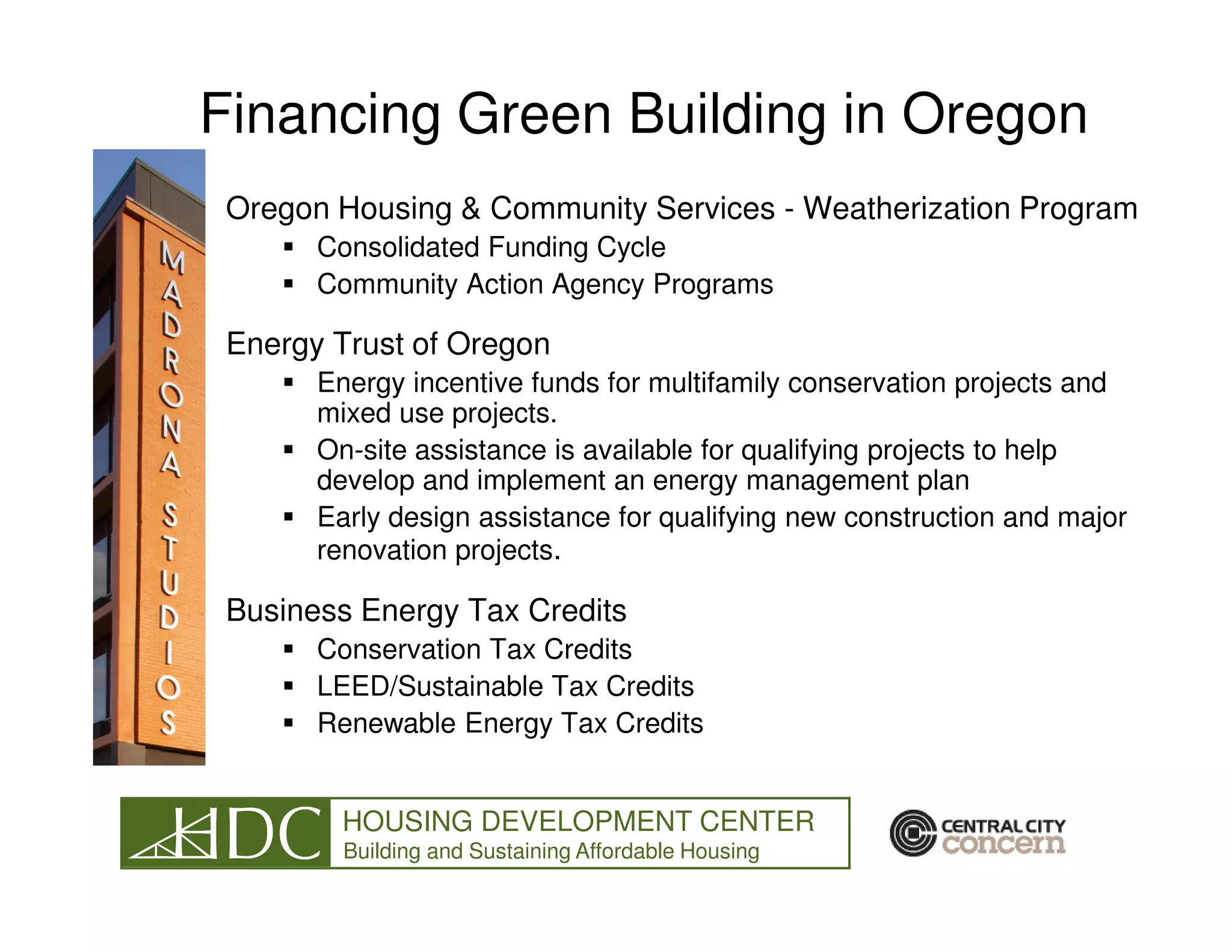 The document discusses green building financing options in Oregon and summarizes a case study of the Madrona Studios/Hooper Center mixed-use redevelopment project in Portland. The project redeveloped a 1960s hotel into 176 affordable housing units and a treatment facility using sustainable practices like energy modeling, solar thermal panels, efficient appliances and lighting, water conservation, and local/recycled materials. Key financing came from tax credits, energy incentives, and low-income housing tax credits. The case study highlights lessons learned around team coordination, adaptive reuse, and balancing energy goals with existing conditions.