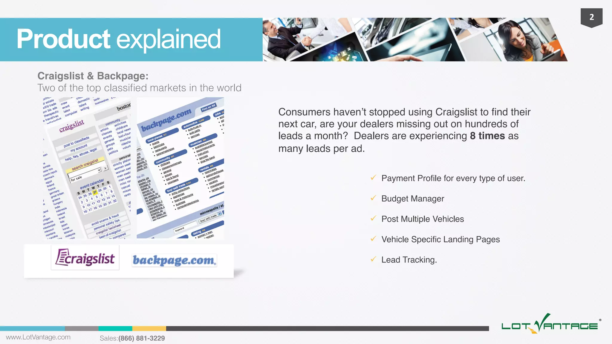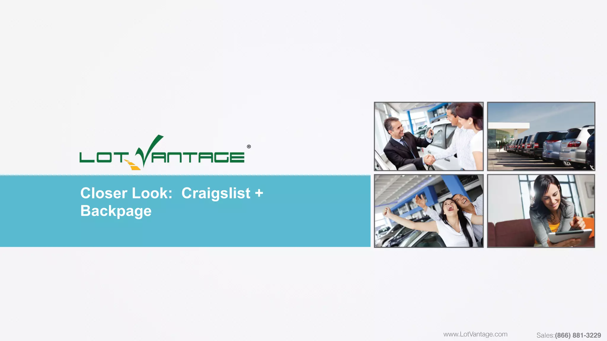 This document discusses LotVantage, a service that allows dealers to easily post vehicle ads to Craigslist and Backpage. It streamlines the classified ad posting process, allows dealers to post multiple ads at once or over time, tracks ad performance and leads generated, and integrates with dealer CRM systems. LotVantage aims to make classified advertising simple, efficient, and effective for dealers to gain more leads through popular classified websites.