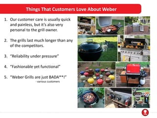 Customers love Weber grills because they offer quick and personal customer care, high reliability and durability compared to competitors, and have a fashionable yet functional design. Some things customers wish Weber would improve include leveraging technology to enhance customer service, such as implementing new technologies over the next five years to improve the customer experience, similar to how other brands provide excellent customer service.