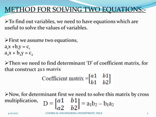 Kishan Kasundra presented on Cramer's rule for solving systems of equations. Cramer's rule uses determinants of coefficient matrices to find variables. It can be applied to systems with 2 or 3 equations. For 2 equations, the determinant of the original coefficient matrix and matrices with the coefficient columns replaced by the constants are calculated. The ratios of these determinants over the original give the variables. For 3 equations, a similar process is followed using a 3x3 coefficient matrix. An example showed applying Cramer's rule to solve a 2x2 system.