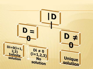 3) Three examples demonstrate applying Cramer's rule to find the unique solution, that there is no solution, and that there are infinitely many solutions, respectively.