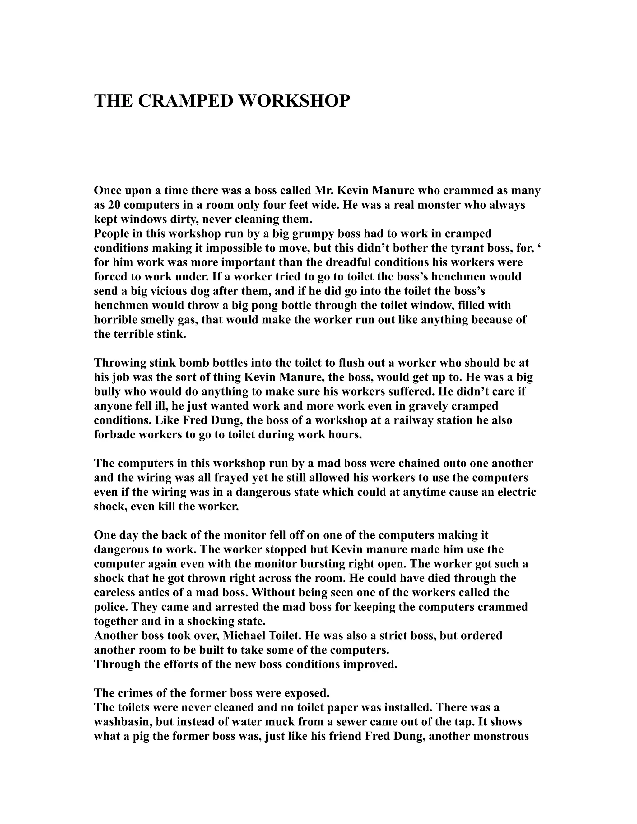 Kevin Manure was a cruel boss who crammed 20 computers into a tiny, dirty workshop. He forbade workers from using the bathroom and would harass them with stink bombs if they tried. The computers were chained together and had frayed, dangerous wiring but Manure forced the workers to use them anyway. One worker received a fatal electric shock from a computer with an exposed monitor. The police were called and arrested Manure for the unsafe and inhumane conditions. A new boss, Michael Toilet, took over and improved conditions by building a new room and cleaning the bathrooms.