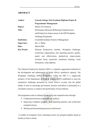 This document provides an abstract for a dissertation submitted by Conrad Sebego for the degree of Master of Commerce in Project Management at Cranefield College of Project and Programme Management. The dissertation examines performance measures that reflect competitiveness and productivity improvement in the National Productivity Institute's Workplace Challenge Programme. The Workplace Challenge Programme aims to improve productivity and competitiveness through collaboration between employers and workers, improving workplace practices, and sharing processes and lessons learned. The research focused on identifying factors to consider when developing uniform measurements for quality, speed, cost and employee morale across companies participating in the Workplace Challenge Programme.