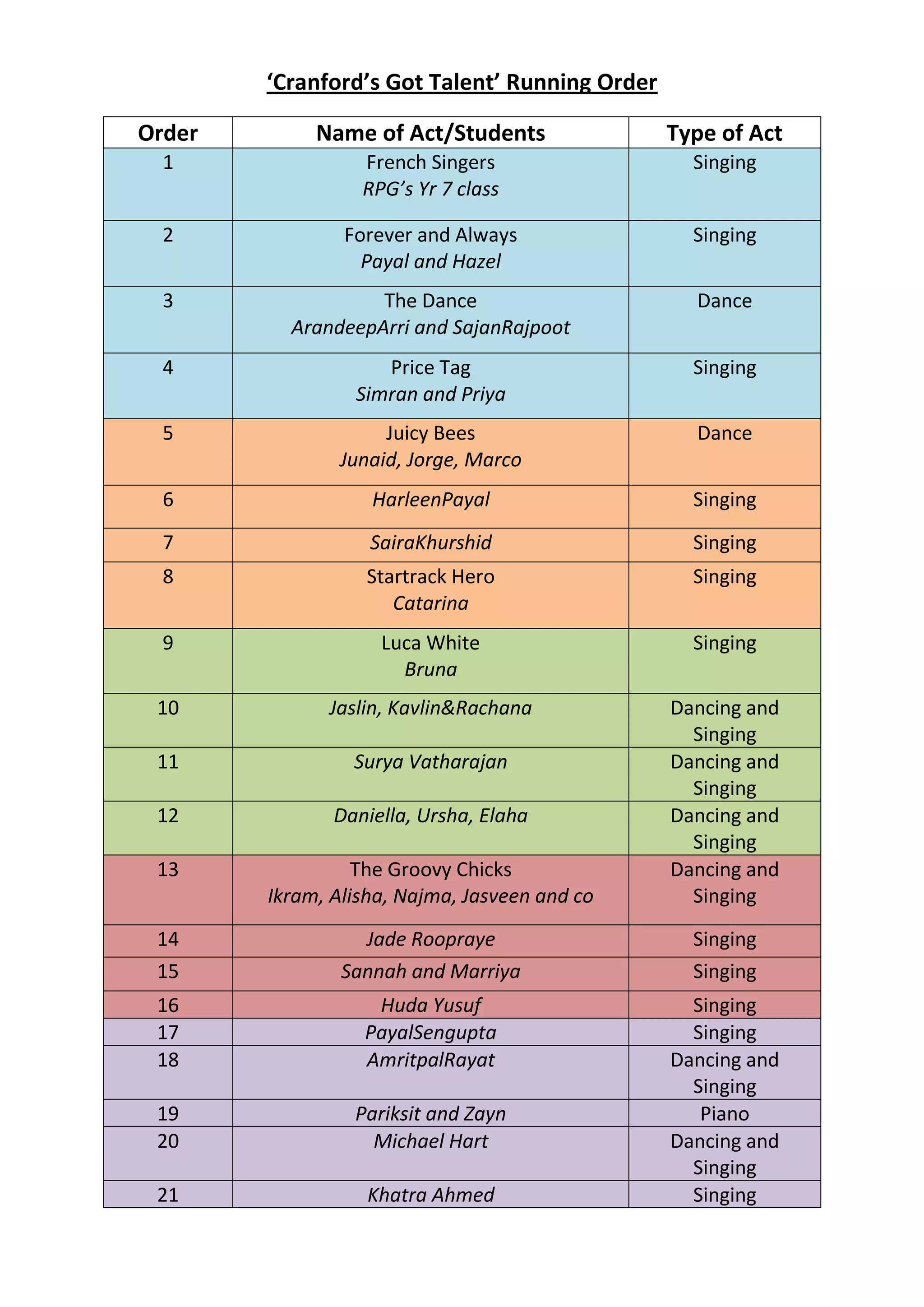 The document provides the running order for 'Cranford's Got Talent' listing 21 acts in order of performance. The acts include singing, dancing, and dancing/singing performances by individuals and groups of students. The types of acts and names of the performing students or groups are listed next to the order number.