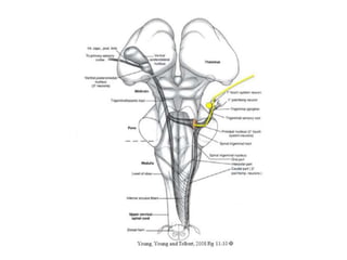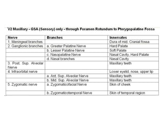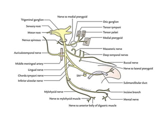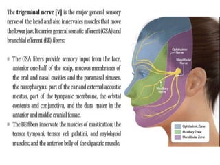 The trigeminal nerve has three divisions - ophthalmic, maxillary, and mandibular. It is a mixed nerve, carrying both motor and sensory fibers. The ophthalmic division innervates the forehead and orbits. The maxillary division innervates the midface, and the mandibular division innervates the lower face, jaw, and neck. Each division has numerous branches that carry sensory information from the face and motor commands to muscles like the masseter and medial pterygoid. The trigeminal ganglion contains the cell bodies of the sensory neurons for cranial nerve V.