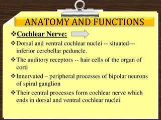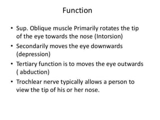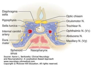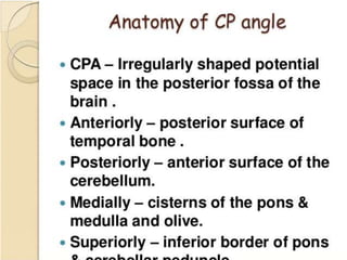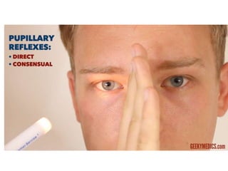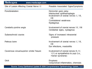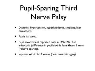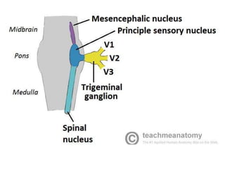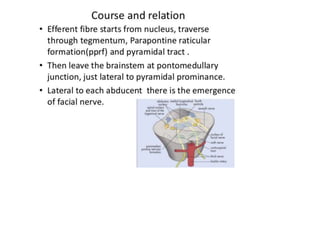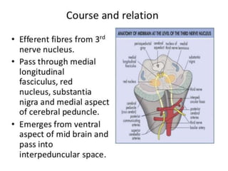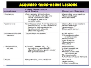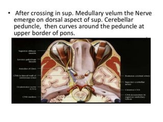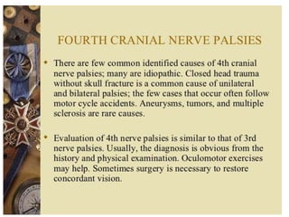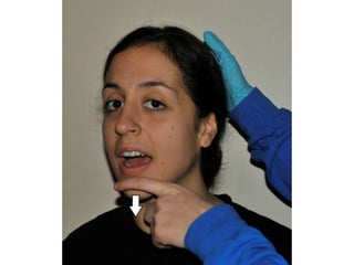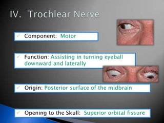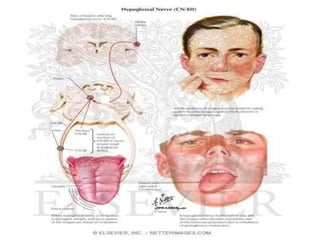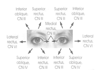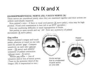Cranial nerve examination involves positioning and comforting the patient, then testing individual nerves using specialized maneuvers like visual acuity tests, eye movement assessments, facial expression checks, and sensory evaluations to identify potential lesions. Proper lighting and explanation of procedures is important. Each nerve is analyzed for motor, sensory and reflex functions to localize neurological disorders.