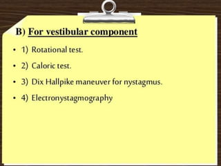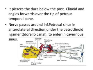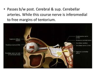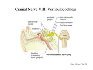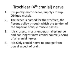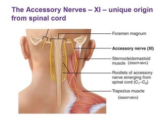This document provides information about examining the 12 cranial nerves. It discusses approaches to testing each nerve including optimal positioning of the patient, specific maneuvers to assess nerve function, and potential causes of abnormalities. For each nerve, it describes the anatomical course and key structures innervated. The summary focuses on testing methodology: