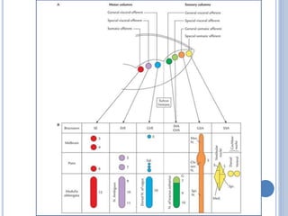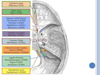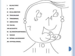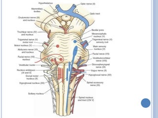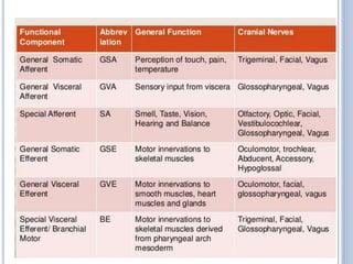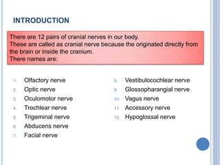 There are 12 pairs of cranial nerves that originate directly from the brain or inside the cranium. The first two cranial nerves, the olfactory and optic nerves, originate from the forebrain. Cranial nerves 3 through 12 arise from the brainstem, with nerves 3-4 originating from the midbrain, nerves 5-8 from the pons, and nerves 9-12 from the medulla oblongata. The cranial nerves consist of sensory nerves, motor nerves, or mixed nerves and are involved with functions like vision, facial movements, hearing, balance, taste, and internal organ control.