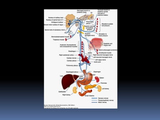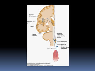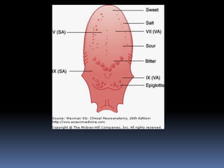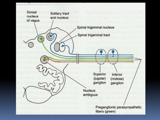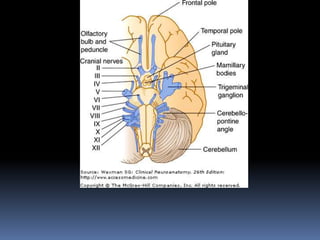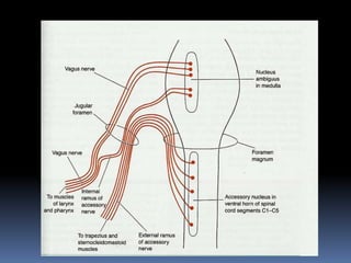 The document summarizes the origin and functional components of the 12 cranial nerves. It discusses that cranial nerve fibers with motor functions arise from nuclei in the brainstem, while sensory fibers originate from ganglia outside the brainstem. The cranial nerves have different functional components including somatic efferent, visceral efferent, and somatic/visceral afferent fibers. Specific cranial nerves are described in more detail, including their nuclei of origin, peripheral innervation, and clinical correlations of damage.