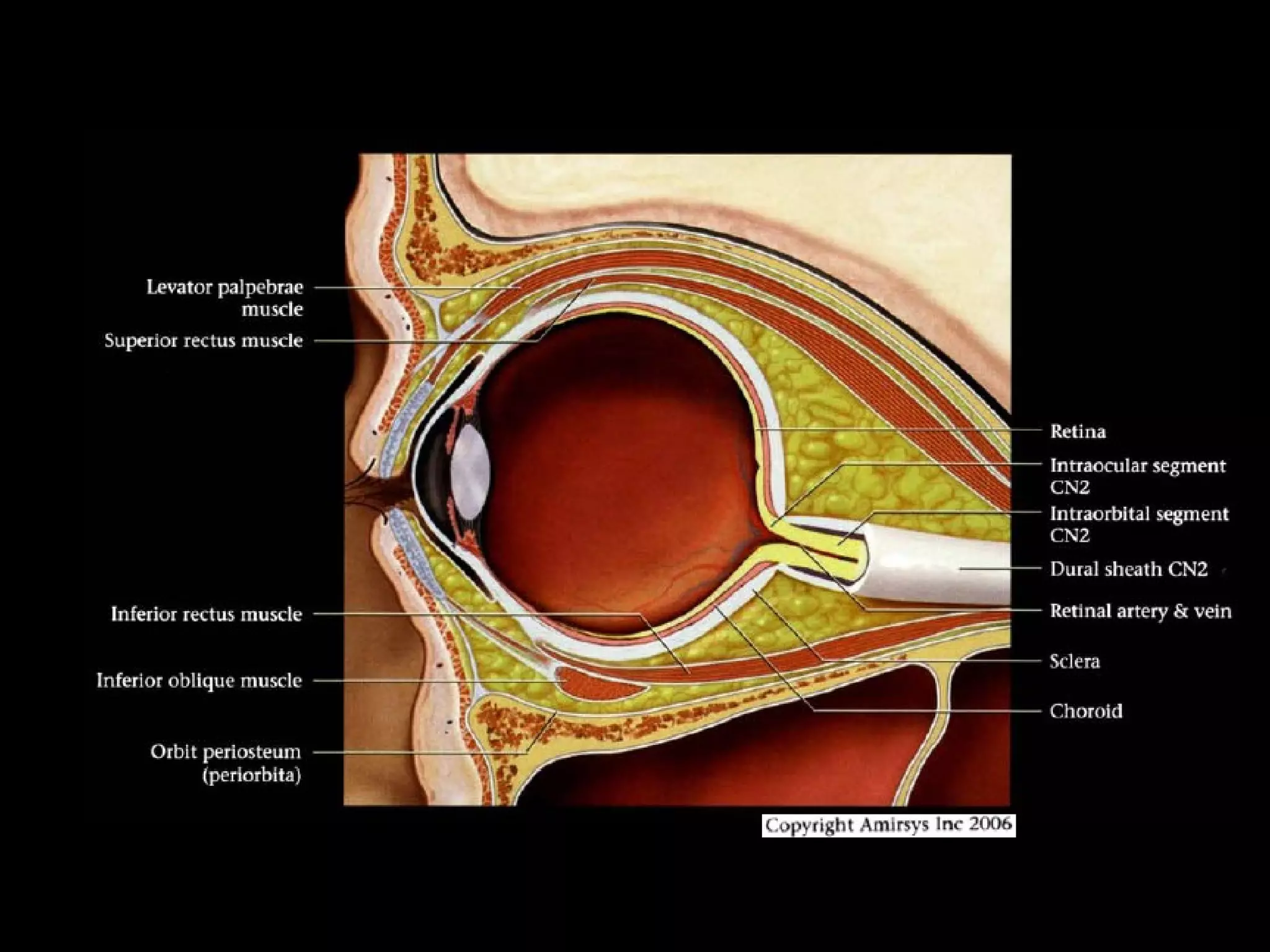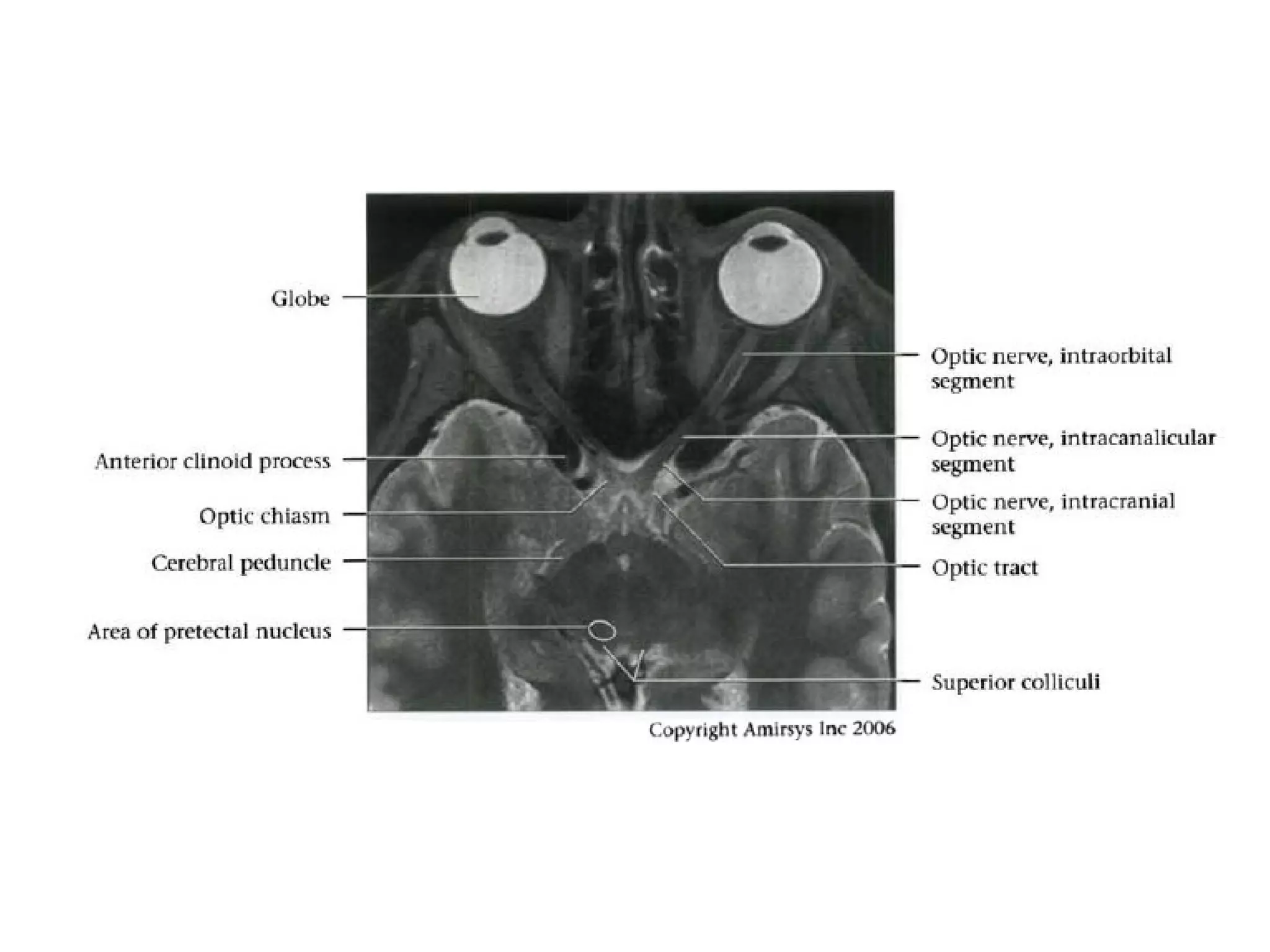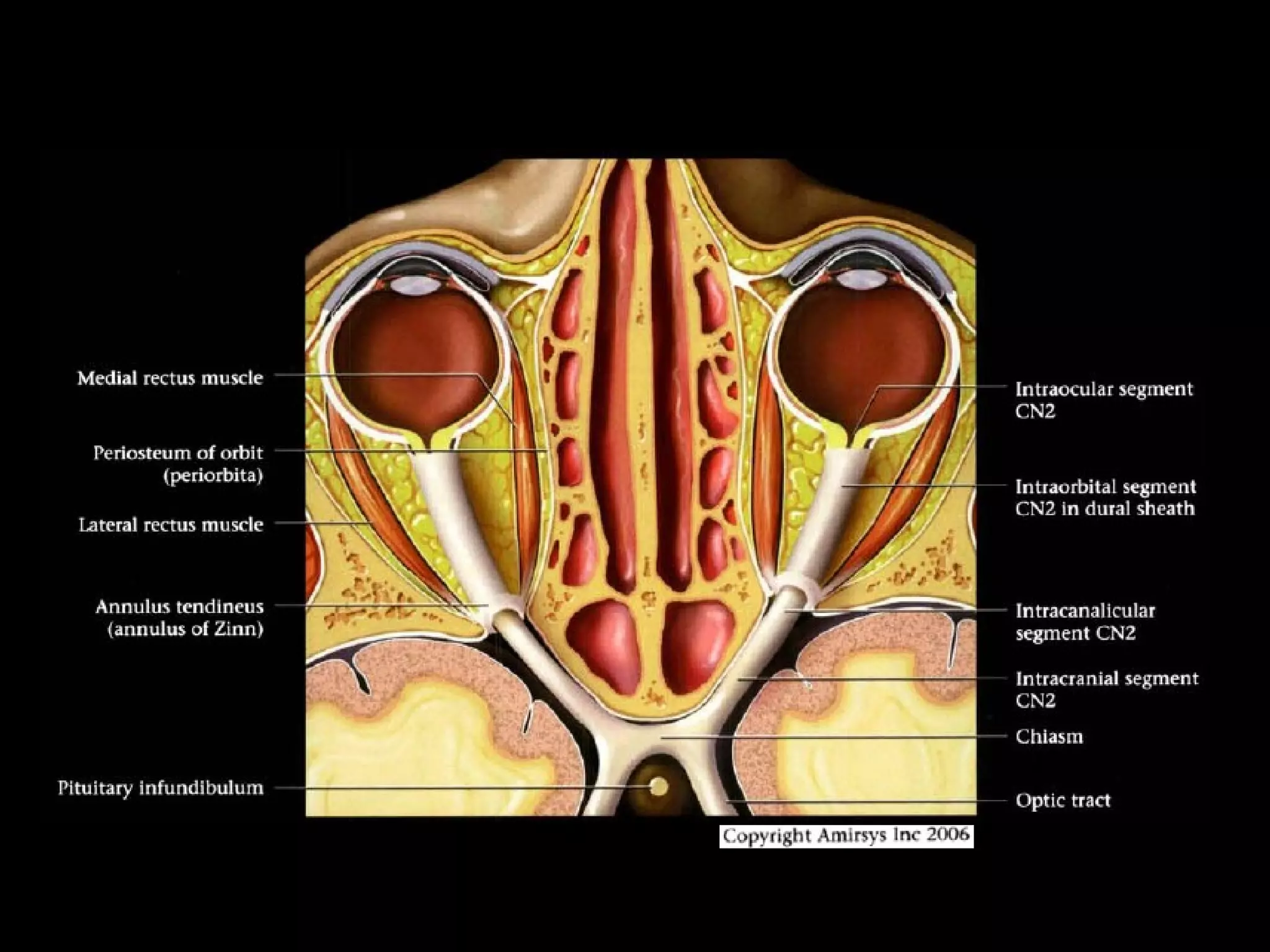 The optic nerve (CN2) is the nerve of sight. It has four segments - intraocular, intraorbital, intracanalicular, and intracranial. In the optic chiasm, nerve fibers from the medial half of each retina cross to the opposite side. From the chiasm, the optic tracts extend posteriorly to terminate in the lateral geniculate bodies of the thalamus, forming connections to the primary visual cortex via the optic radiations.