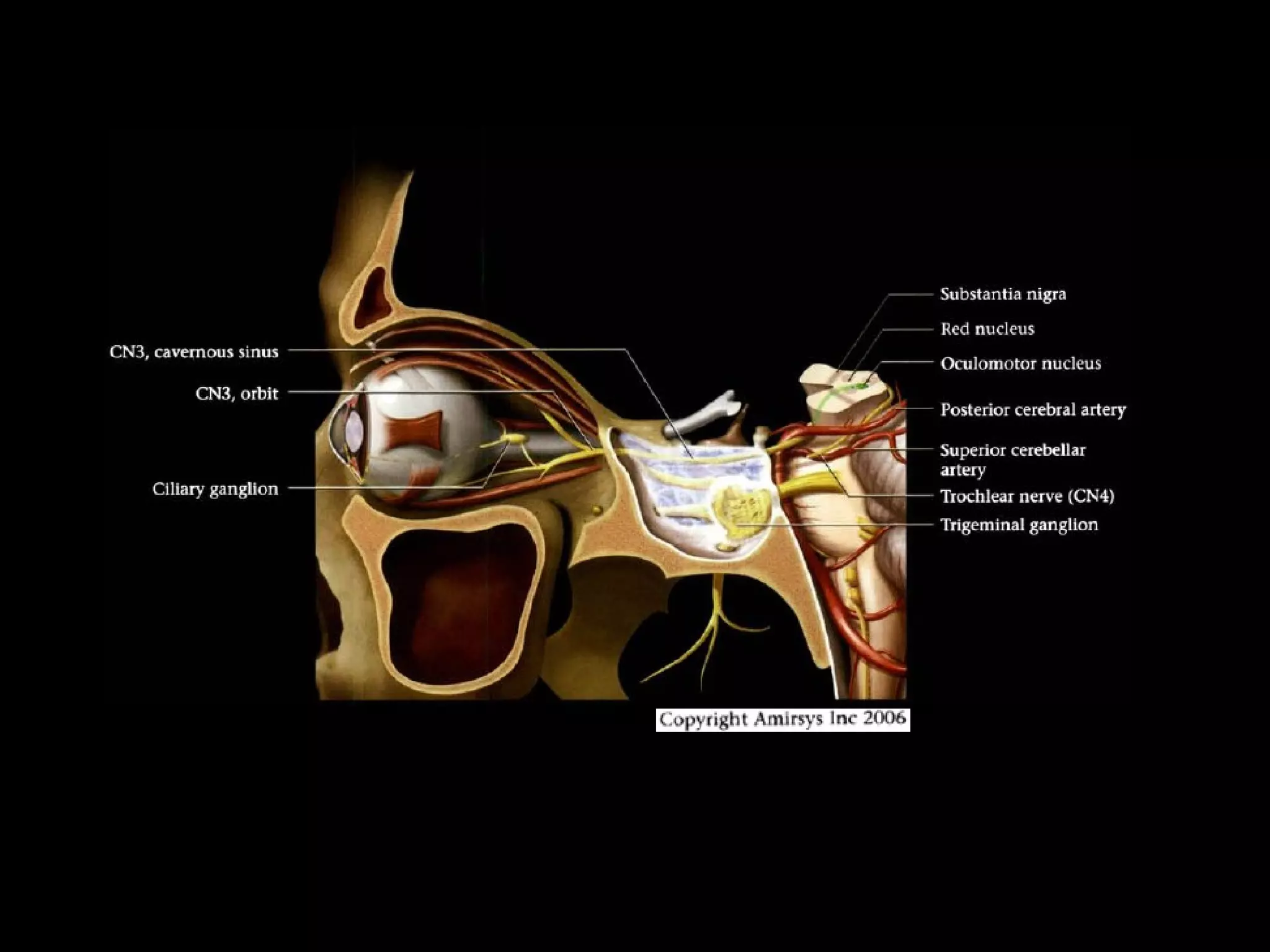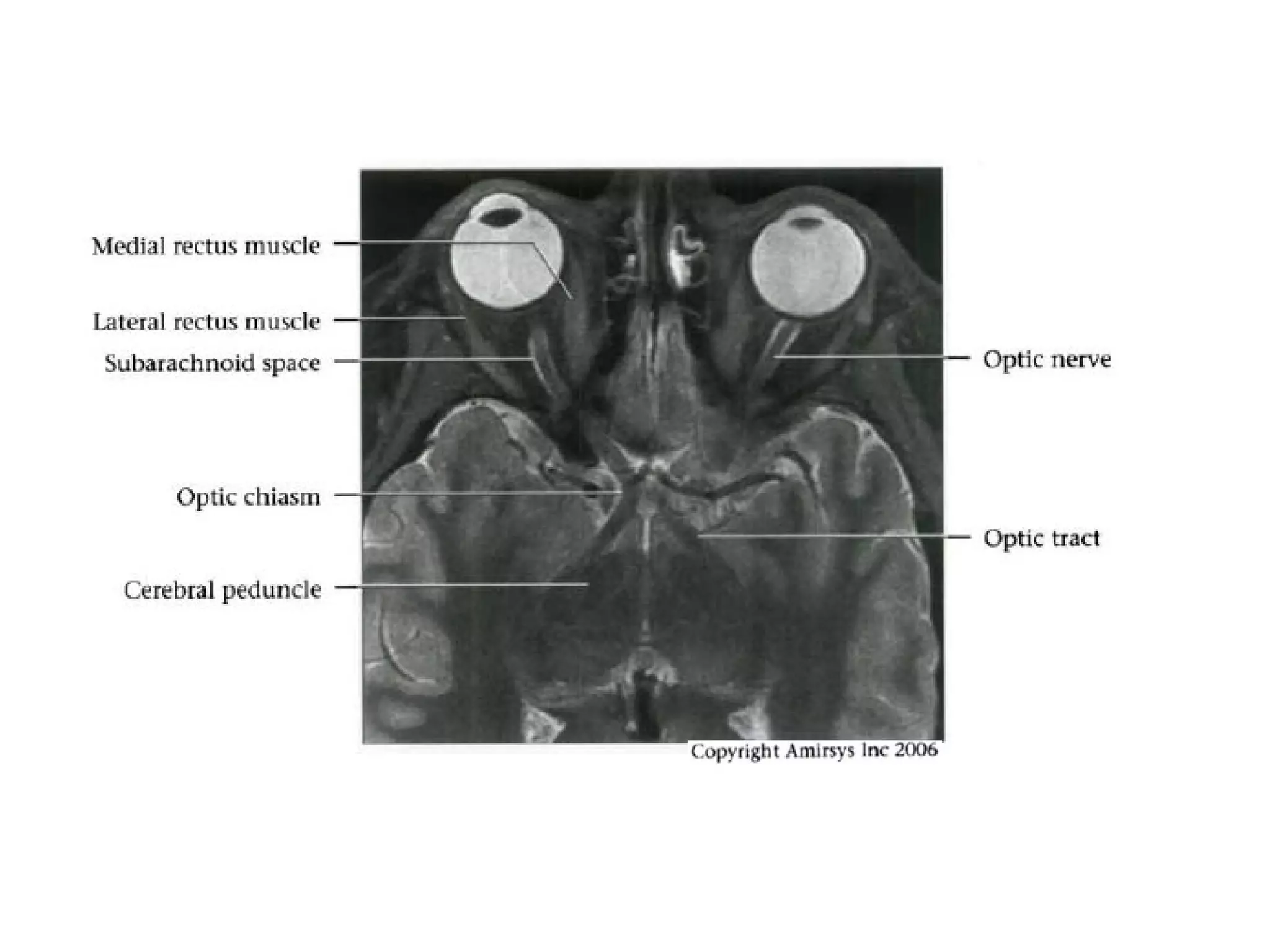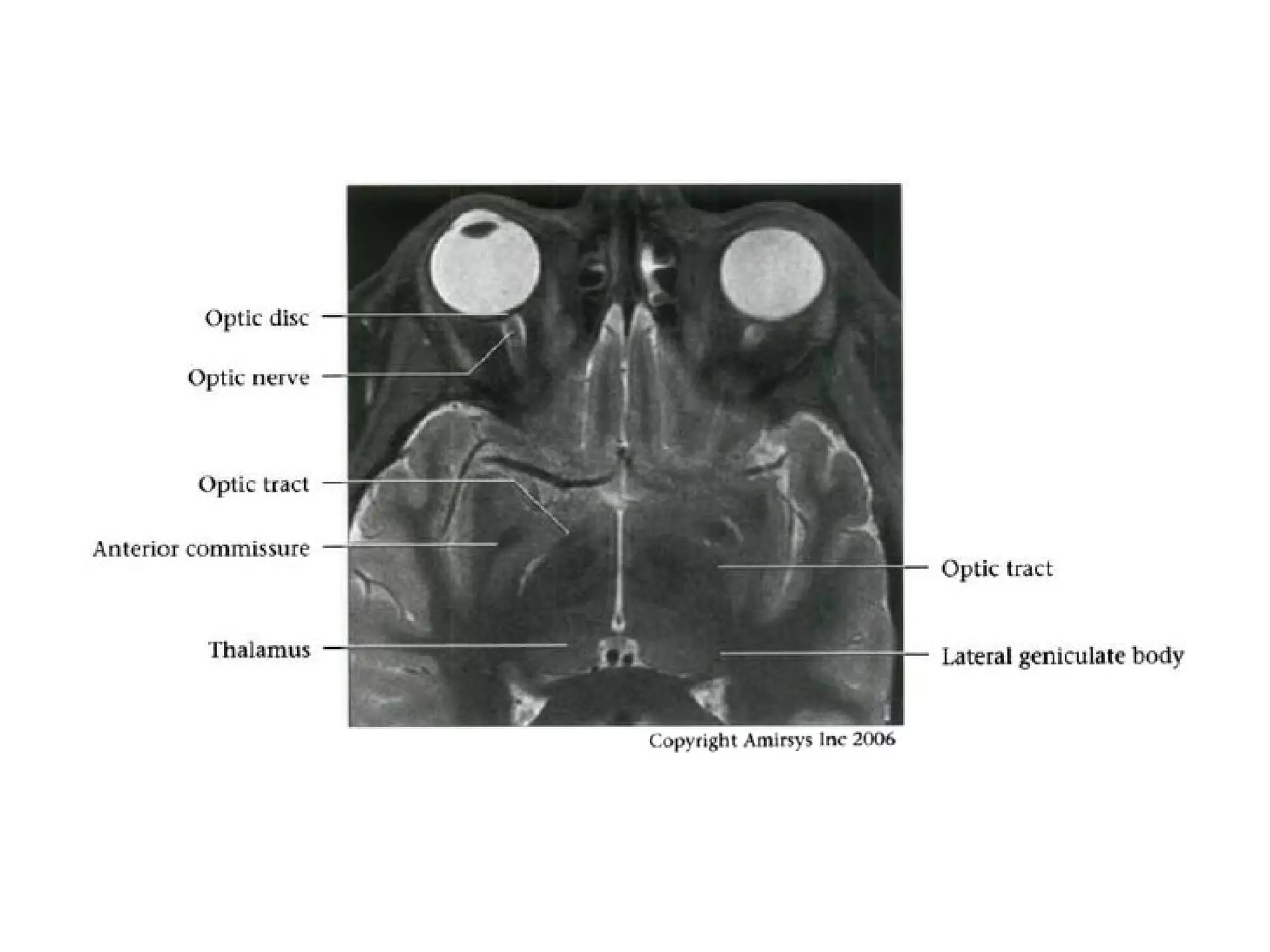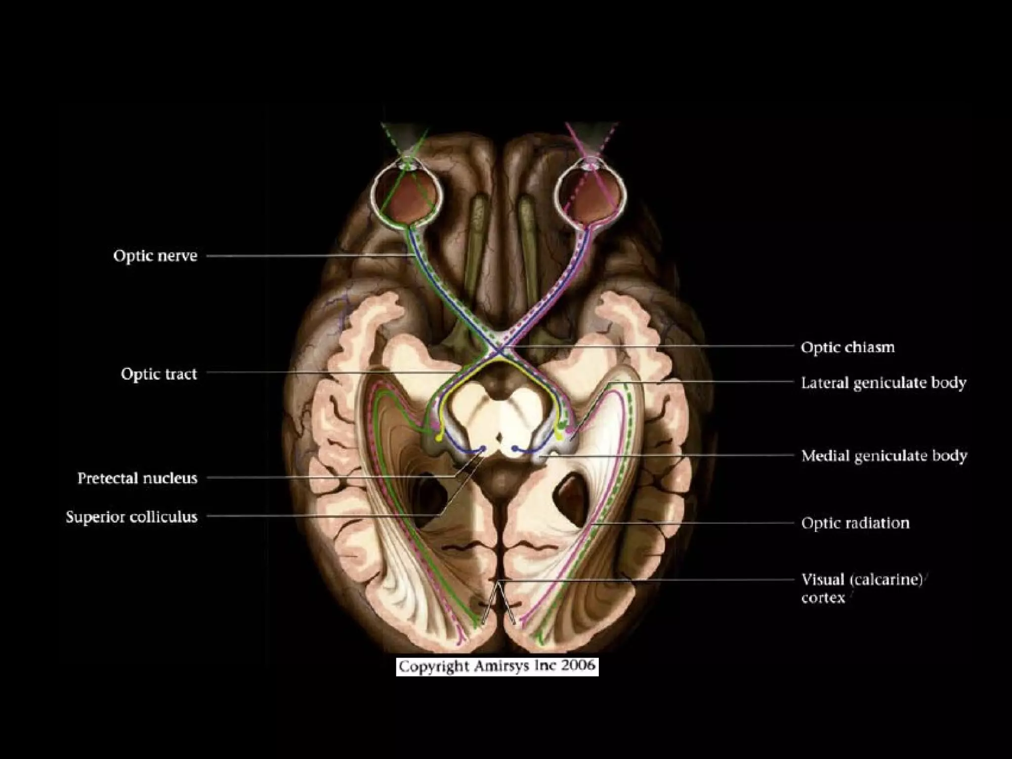 The optic nerve (CN2) is the nerve of sight. It has four segments - intraocular, intraorbital, intracanalicular, and intracranial. In the optic chiasm, nerve fibers from the medial half of each retina cross to the opposite side. From the chiasm, the optic tracts extend posteriorly to terminate in the lateral geniculate bodies of the thalamus, forming connections to the primary visual cortex via the optic radiations.
