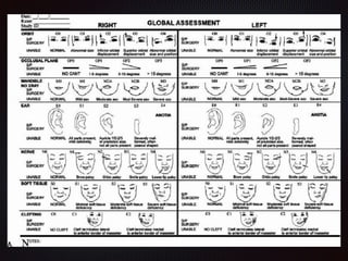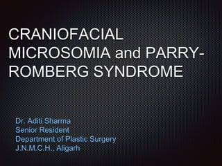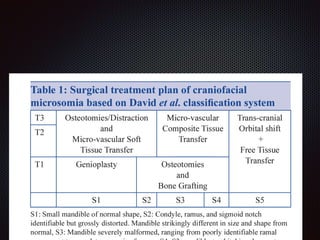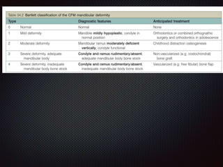 This document discusses craniofacial microsomia (CFM), a birth defect involving structures from the first and second branchial arches. CFM causes facial asymmetry and affects the mandible, ear, and soft tissues. It has various proposed causes but is thought to involve disruption of neural crest cell migration. Diagnosis involves assessing the skeletal, auricular and soft tissue involvement. Treatment planning relies on thorough documentation through photos, CT scans and cephalograms to characterize the abnormalities.
