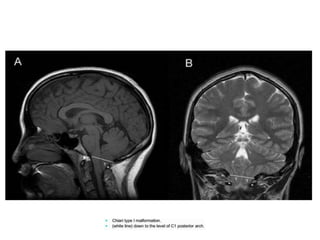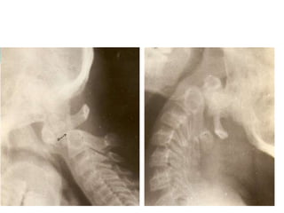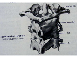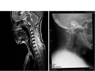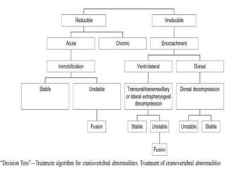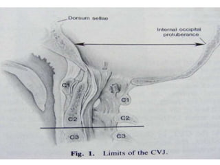 The craniovertebral junction refers to the occiput, atlas, and axis vertebrae and their articulations and ligaments. It is a complex anatomical region forming the transition between the skull and cervical spine. Common craniovertebral junction anomalies include occipitalization of the atlas, basilar invagination, atlantoaxial dislocation, and dens dysplasia. These anomalies can be developmental, post-traumatic, or acquired. Imaging studies including X-rays, CT, MRI are used to classify and evaluate the anomalies. Treatment may involve surgery such as fusion if the anomaly causes spinal cord compression.