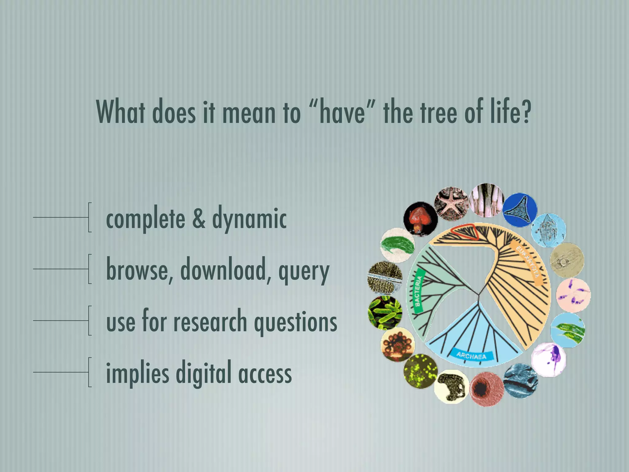 This document summarizes the goals and progress of the Open Tree of Life project, which aims to synthesize a complete draft tree of life using existing phylogenetic data. The project has collected phylogenetic data from over 7000 studies and stored it using graph databases. An open public interface allows users to browse, download and query the tree. The project is on track to release an initial draft tree in year 1 and refine it based on user feedback in year 2, while expanding collaborations and incentives for data contributors.
