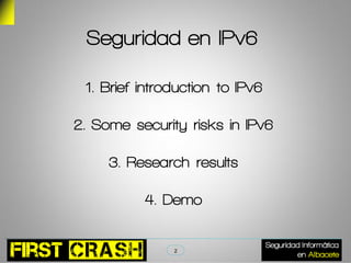 This document discusses IPv6 security risks. It begins with a brief introduction to IPv6 and its address types. It then outlines some hacking tools for IPv6 like parasite6 for man-in-the-middle attacks. Research results show administration services are exposed on the public internet through IPv6 prefixes. A demo shows tunneling and NDP flooding attacks on IPv6 networks. The document concludes by asking if the audience has any questions.