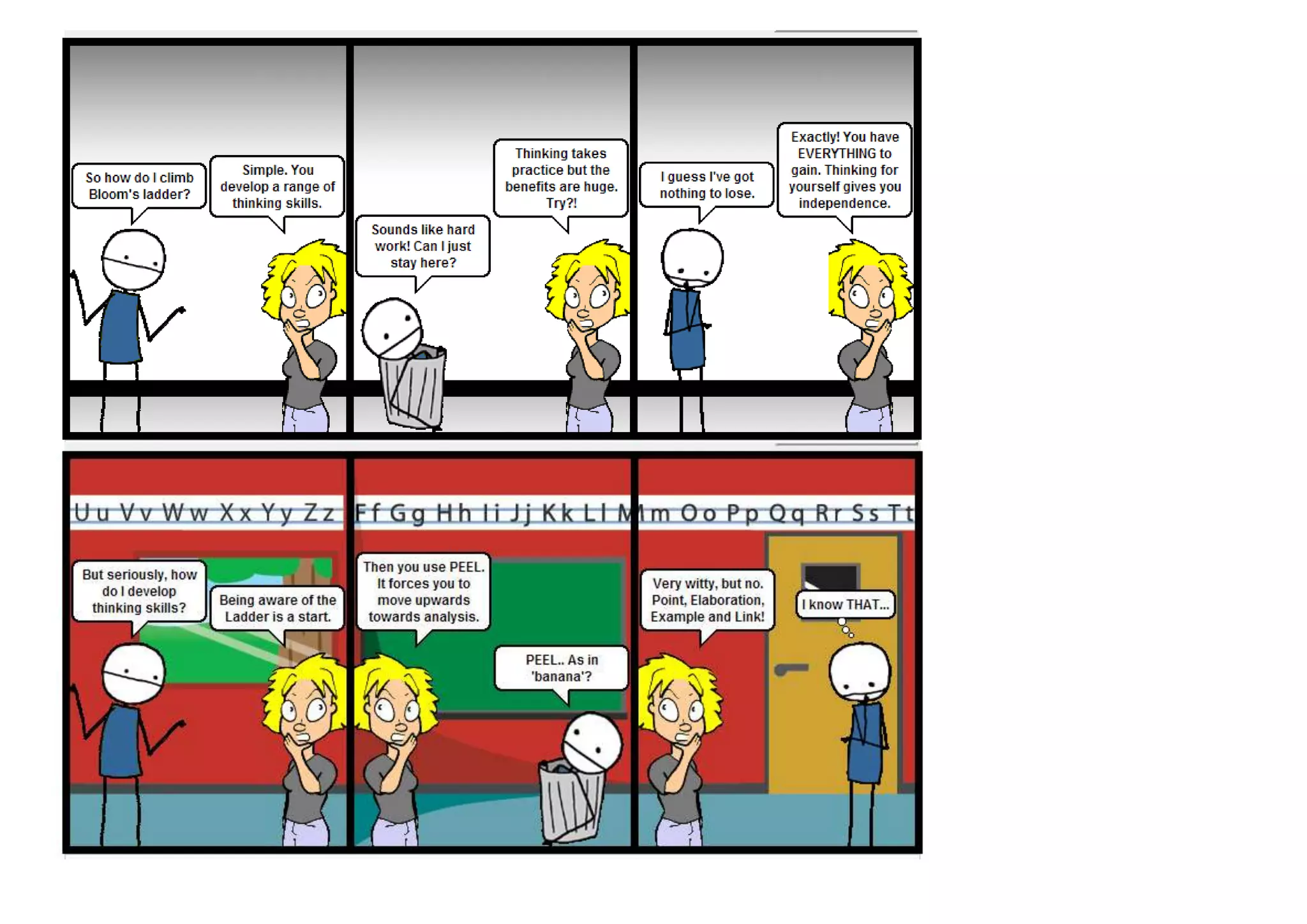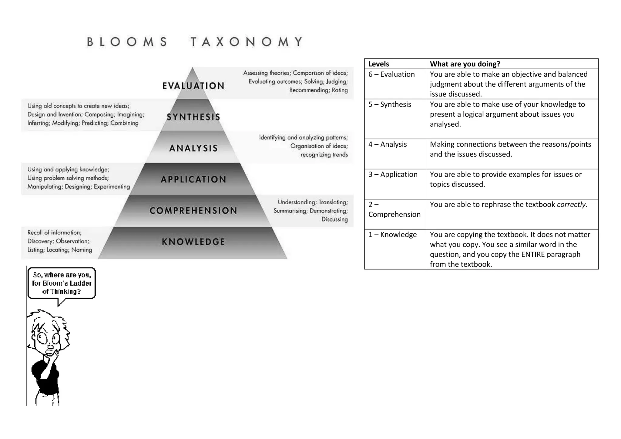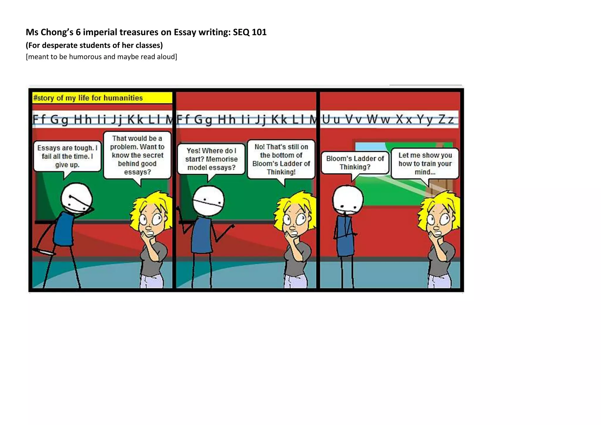 1) Ms. Chong provides 6 levels of thinking based on Bloom's taxonomy to help students structure their essay writing, ranging from simply copying information to making balanced judgements.