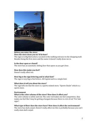 The document provides observations from visits to 6 stores in a shopping mall: Sports Chalet, See's Candies, The Apple Store, The Body Shop, Yogenfruz, and Abercrombie and Fitch. Detailed observations are provided for Sports Chalet, See's Candies, The Body Shop, and The Apple Store, covering the store environment, products, personnel, and customers. The stores appealed to different senses and had distinct themes, with Apple having a simple, minimalist theme and See's Candies focusing on the sense of smell with its chocolate scents.