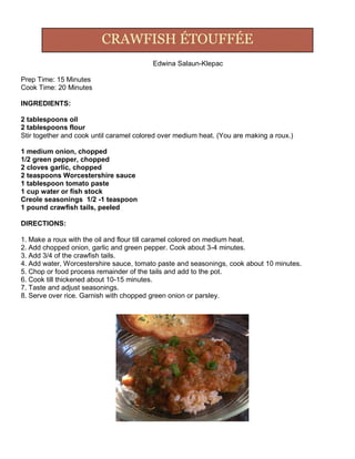 This recipe is for Crawfish Étouffée, a Louisiana specialty. It involves making a roux with oil and flour, then adding onions, garlic, green peppers and 3/4 of a pound of crawfish tails. Water, Worcestershire sauce, tomato paste and Creole seasonings are stirred in, along with the remaining chopped crawfish tails. The mixture is cooked for 10-15 minutes until thickened, then served over rice and garnished with green onions or parsley.