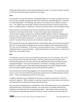 The document presents a maturity model called "Crawl, Walk, Run, Fly" to help non-profits improve their use of social media and other emerging technologies. It describes four levels of practice: Crawl (not using or inconsistent use), Walk (using one tool but not strategically), Run (using tools strategically but needing to scale), and Fly (having mastered strategic and scaled use). Moving from level to level involves taking incremental steps to develop communications strategies, build internal capacity, engage audiences, and implement best practices for measurement and learning. The goal is for non-profits to continuously improve their ability to use digital tools to further their missions.