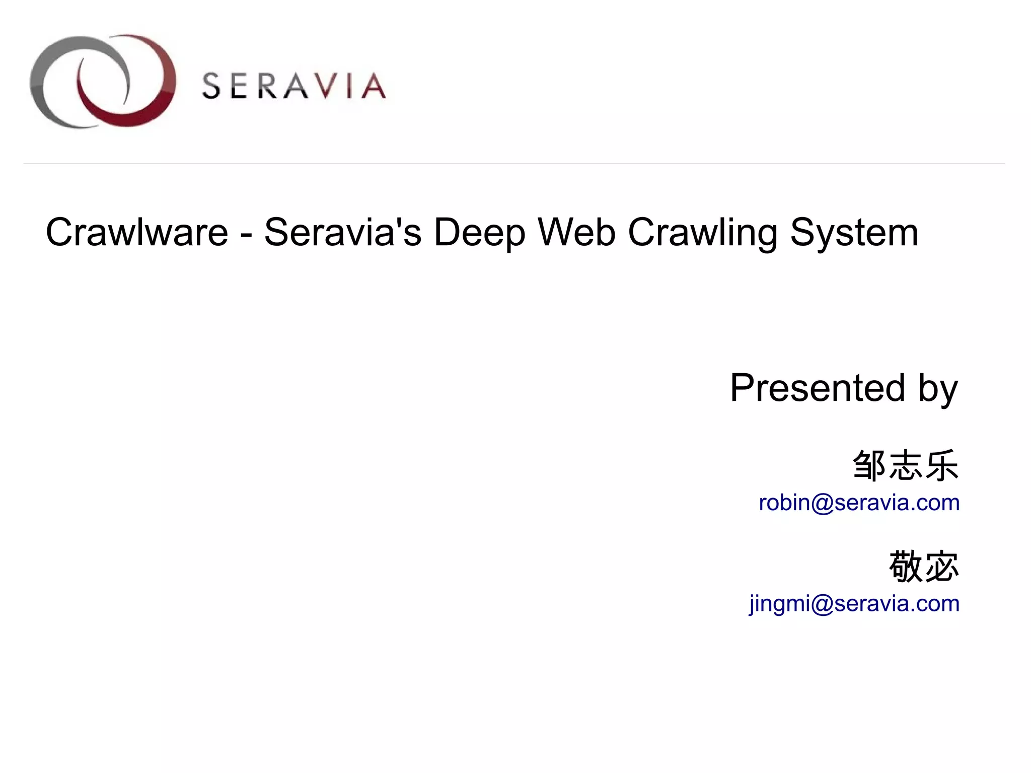 Crawlware is a distributed deep web crawling system that enables scalable and efficient crawls across multiple machines. It uses a job model with reusable actions to customize crawls and extracts data through complex queries. Key components include a payload generator that schedules crawls in parallel across sites, rate control to regulate the crawl rate, and auto-deduplication of extracted links. Testing is done through a Sinatra simulation and problems like changing site loads, data freshness, and JavaScript rendering still need to be addressed.