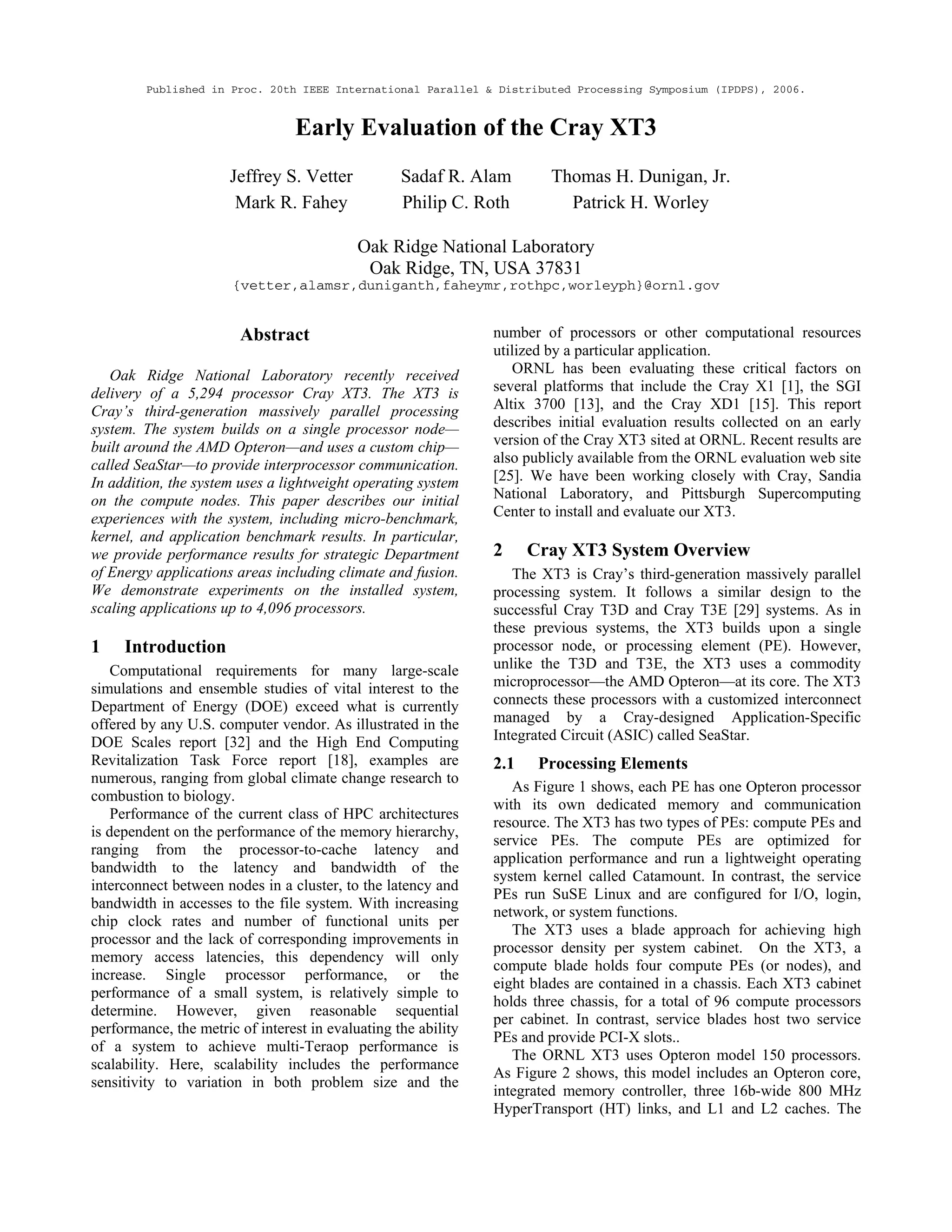 This document summarizes early evaluation results of the Cray XT3 supercomputer installed at Oak Ridge National Laboratory. It describes the system architecture including the AMD Opteron processors, SeaStar interconnect, and Catamount lightweight operating system. It outlines the evaluation approach and benchmarks used, including micro-benchmarks, kernel benchmarks, and full application performance tests in areas like climate and fusion simulations. Initial results show scaling of applications to 4,096 processors and comparisons to other systems like the Cray X1, XD1, SGI Altix, IBM Blue Gene/L, and Earth Simulator.