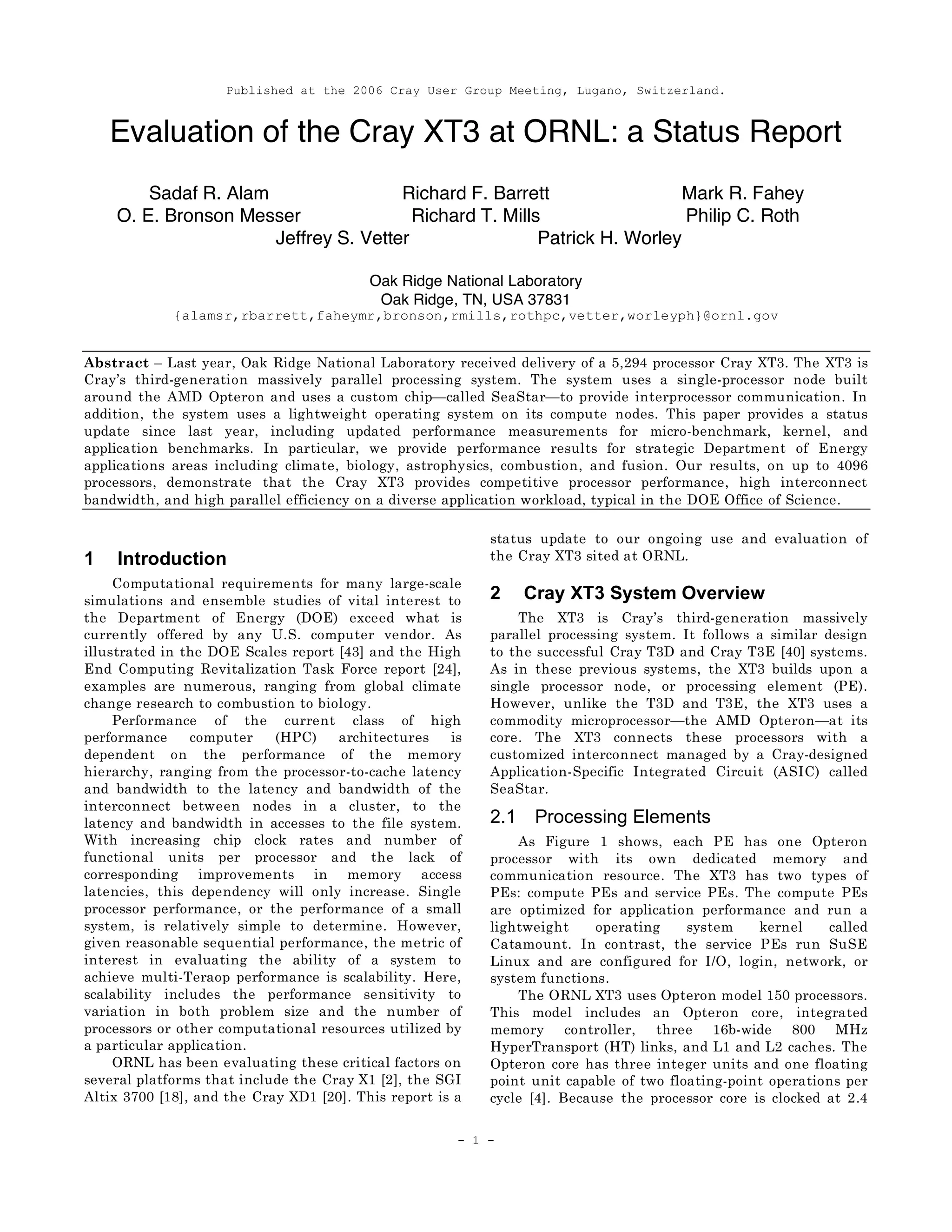 This document provides a status update on Oak Ridge National Laboratory's evaluation of the Cray XT3 supercomputer. It describes the XT3 system architecture including its AMD Opteron processors, SeaStar interconnect, and lightweight operating system. It also summarizes performance results from microbenchmarks, kernels, and applications in areas like climate, biology, astrophysics, combustion, and fusion on up to 4,096 processors, demonstrating the XT3's competitive performance, interconnect bandwidth, and parallel efficiency.