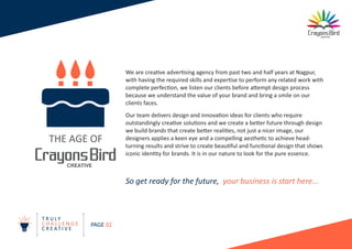 Creative Truly Challenge is an advertising agency based in Nagpur, operating for two and a half years. They emphasize understanding client needs and delivering innovative design solutions to enhance brand identity and loyalty. Their services include brand strategy, identity creation, marketing collaterals, and social media promotion.