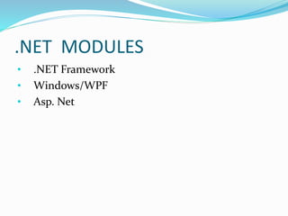 The document outlines key concepts and technologies for .NET modules including the .NET Framework, Windows/WPF, and ASP.NET. It describes fundamentals of the .NET Framework like object oriented programming, language fundamentals, serialization, and collections with generics. For Windows/WPF it covers developing applications, data access, deployment, and XAML coding. ASP.NET topics include developing web applications, HTML, JavaScript, CSS, database connectivity, Ajax, web services, MVC architecture, and more.
