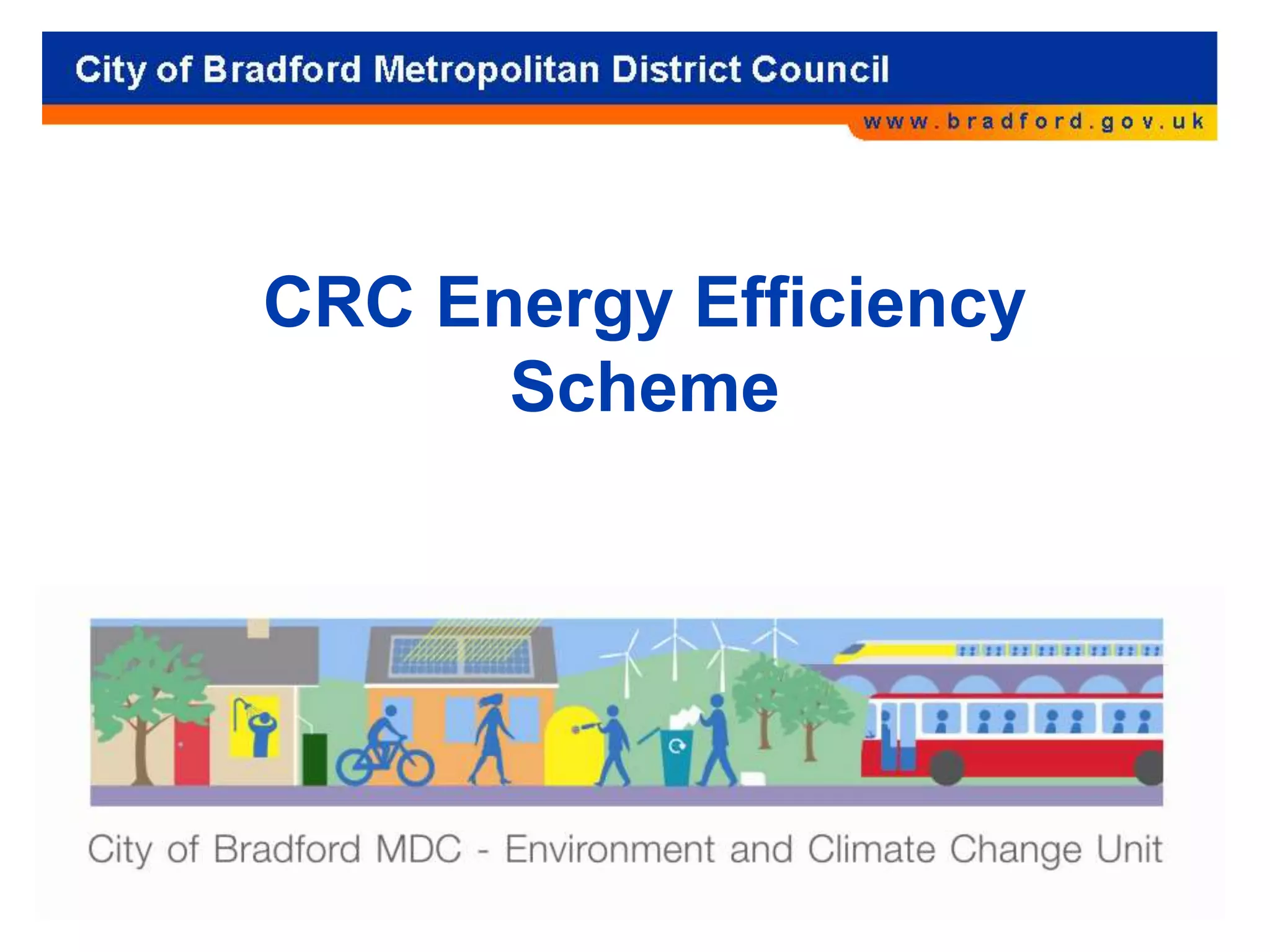 The document provides information on the CRC Energy Efficiency Scheme in the UK. It aims to reduce carbon emissions from large public and private sector organizations by at least 4 million tonnes annually by 2020. The scheme requires organizations using over 6000MWh of electricity per year to monitor and report their energy usage and carbon emissions. It also outlines local government commitments to reduce carbon emissions through various energy efficiency initiatives and renewable technologies. Practical actions organizations can take include utilizing energy efficient contracts, regular meter readings, awareness raising, and communicating changes.