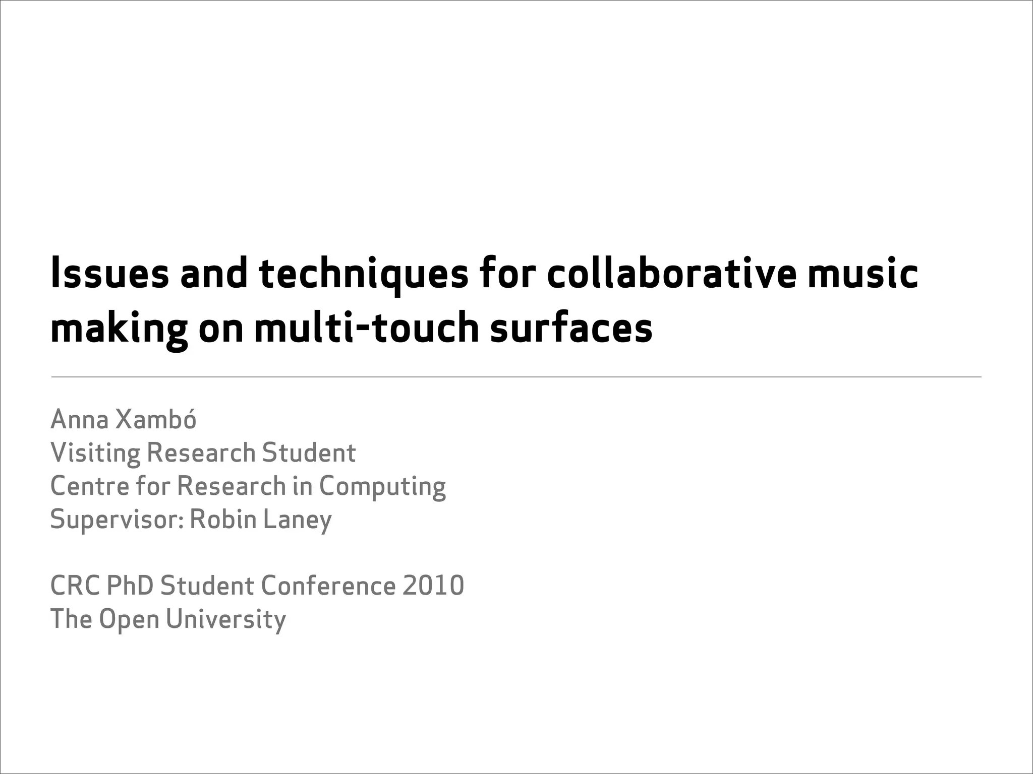 This document summarizes research into collaborative music making using multi-touch surfaces. It describes a study with 12 participants testing a simple music prototype. The study found that the prototype facilitated conversation and group productivity between participants, even for novices. It also provided evidence that roles were shared between participants rather than one person dominating. Future work could improve responsiveness and add both shared and individual controls to better support experts and novices.