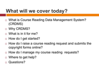 The document provides an overview of the Course Reading Data Management System (CRDMS), which allows faculty to submit and manage course reading requests and copyright forms online. It discusses what CRDMS is, the benefits it provides to faculty, and how to get started using the system, including how to raise course reading requests, submit copyright forms, and manage existing requests. Help for using CRDMS is also available.