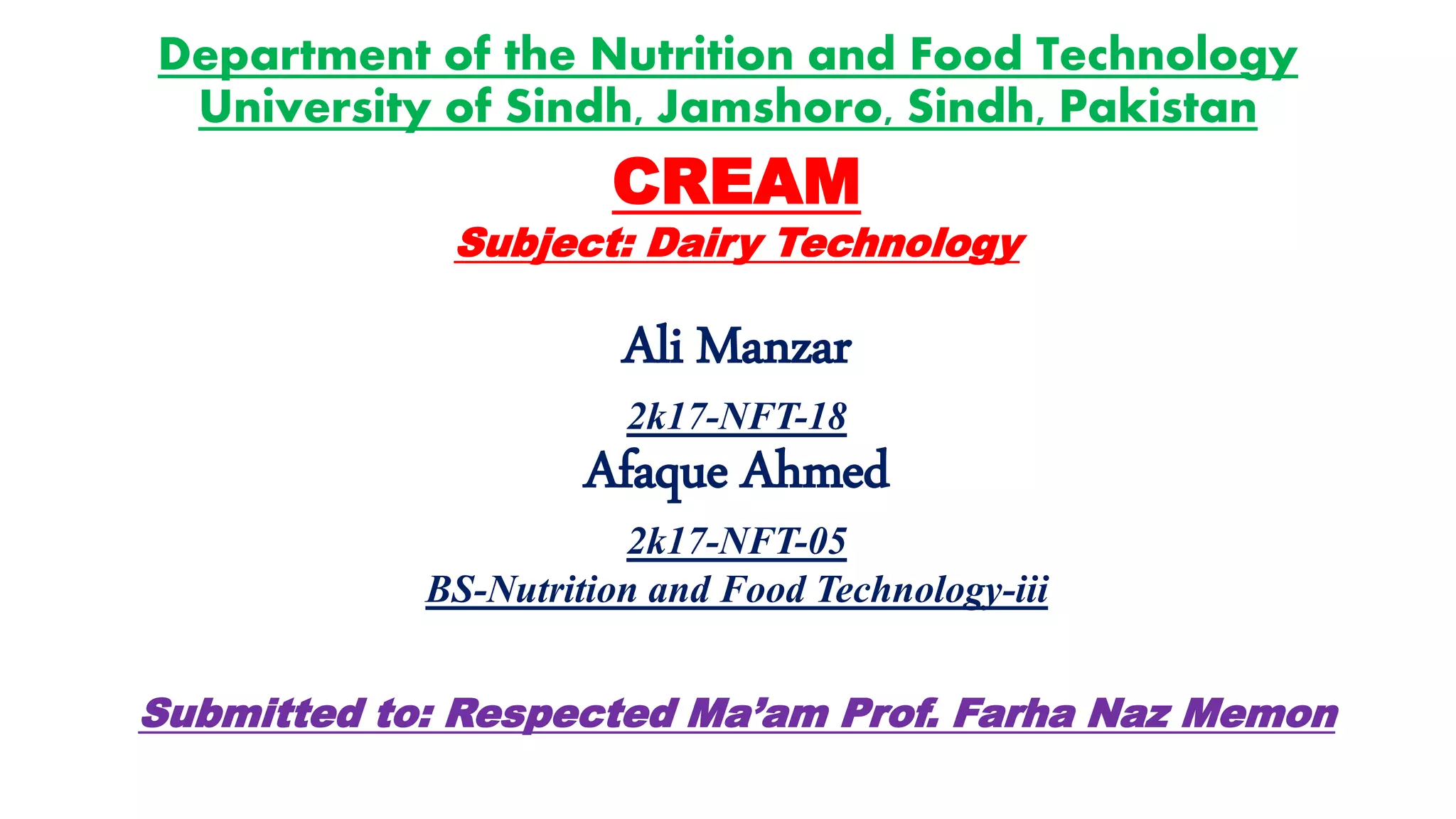 This document discusses cream, including its processing, types, uses, and health benefits. It describes how cream is separated from milk through centrifugation and standardized to a desired fat content. Common types include pasteurized, thick, and acid cream. Cream has various industrial uses in foods like chocolate, bakery products, and ready meals due to its taste, texture, and emulsifying properties. Cream provides health benefits as well, as it contains important vitamins, minerals, and fat that support bone, eye, brain, and heart health.