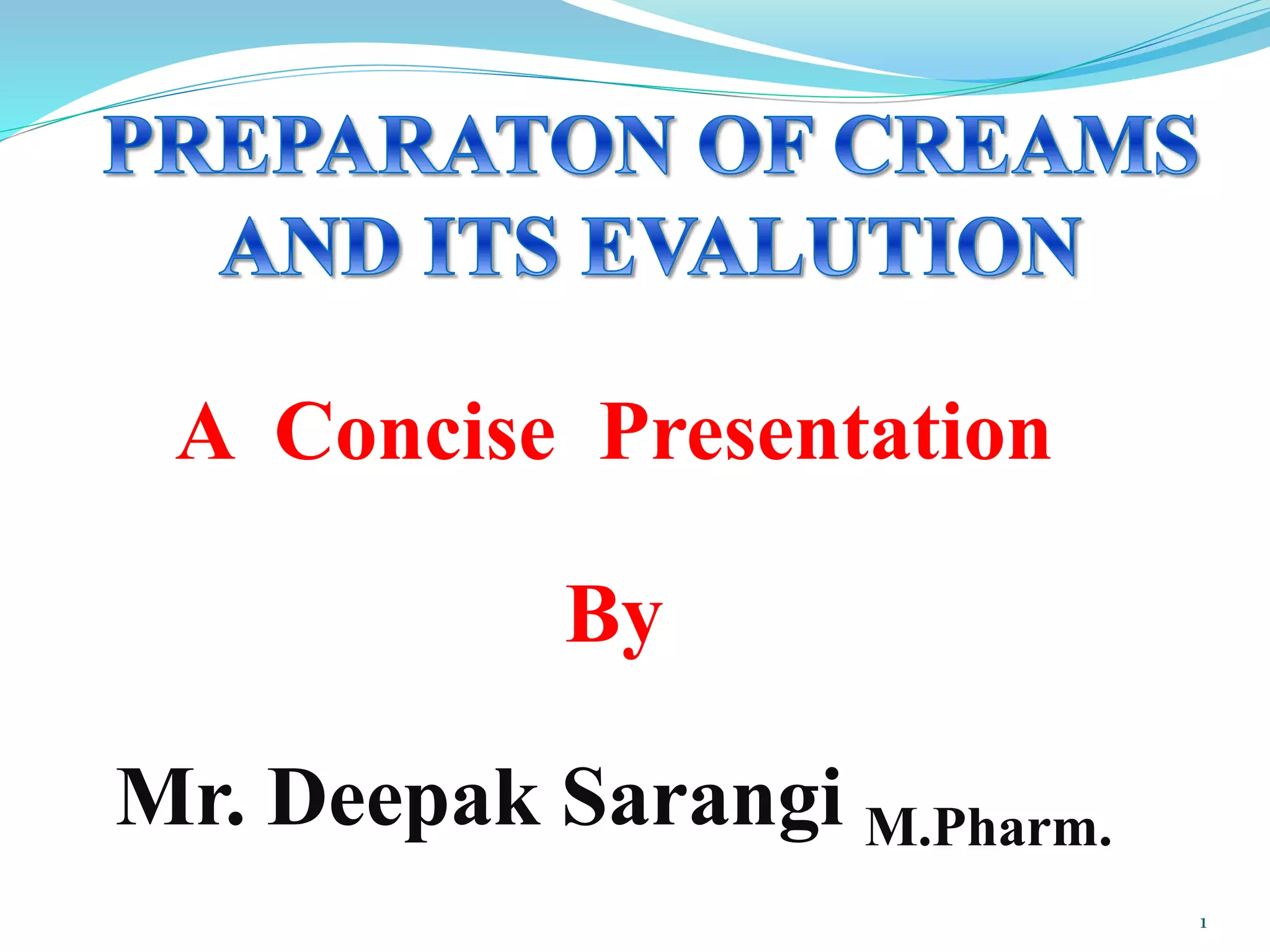 This document provides information on creams as a semisolid dosage form. It begins by defining creams and describing the two main types: oil-in-water (O/W) and water-in-oil (W/O) emulsions. The uses and manufacturing process of creams are then outlined. The document also includes details on specific types of creams, formulations, quality control testing using vertical diffusion cell methods, and concludes with a case study example of a betamethasone cream.