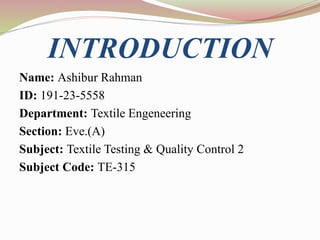 This document discusses the crease recovery of fabrics and the test method. It begins with an introduction of the presenter and topic. Then, it defines crease recovery as a fabric's ability to return to its original position after creasing. It describes the Shirley crease recovery tester used to measure the crease recovery angle. A higher recovery angle indicates better crease recovery. Finally, it outlines the procedure to test crease recovery, which involves creasing a fabric sample between glass plates with weight, then clamping it and measuring the recovery angle.