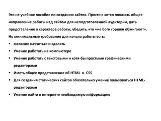 Документ представляет собой руководство по созданию сайта для дошкольного образовательного учреждения, подходящее для неподготовленной аудитории. Он охватывает основные этапы работы, включая подготовку, настройку сервера, выбор подходящей CMS (например, Joomla!) и создание контента, таким образом, что делается акцент на доступности и простоте создания сайта. В документе также подчеркиваются преимущества динамических сайтов по сравнению со статическими.