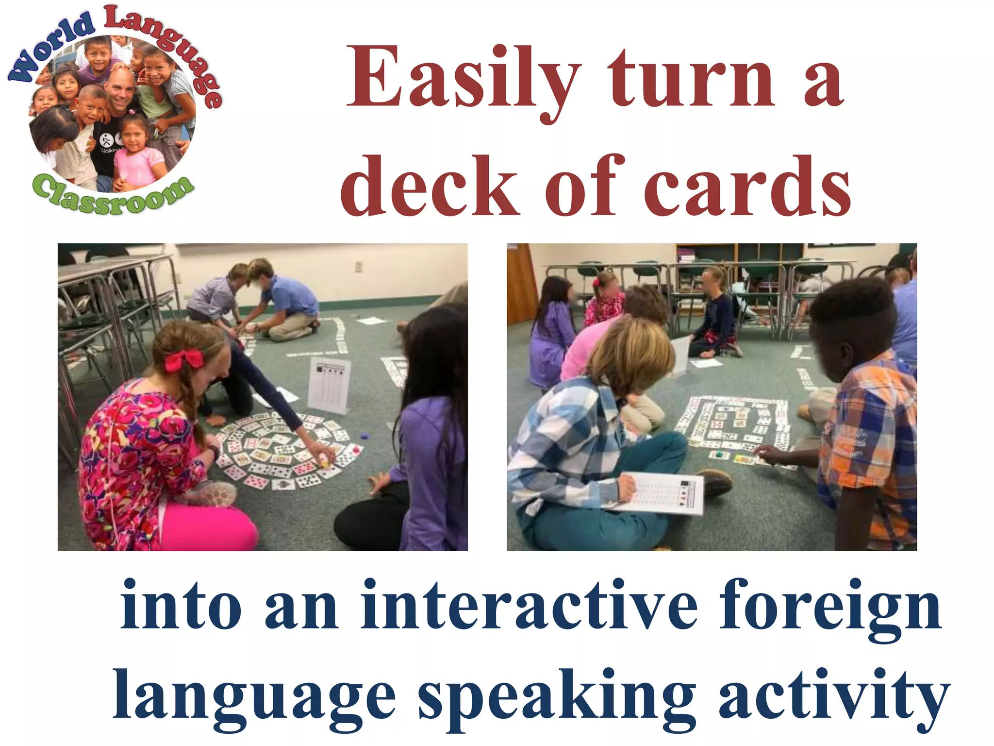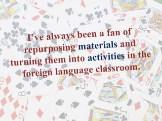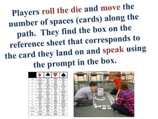 The document describes an interactive foreign language activity using a deck of cards to enhance students' speaking skills. It provides resources like reference sheets and emphasizes adapting activities based on students' proficiency levels. Additionally, it includes tips on keeping the game engaging and encourages students to use their creativity and communication skills effectively.