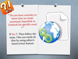 The document provides a step-by-step guide on creating automatic hyperlinks for specific words in Outlook. It outlines the process of setting up the hyperlink through the 'Autocorrect' options in the 'Tools' menu. Users can insert the desired word to trigger the automatic link and save the settings for future emails.