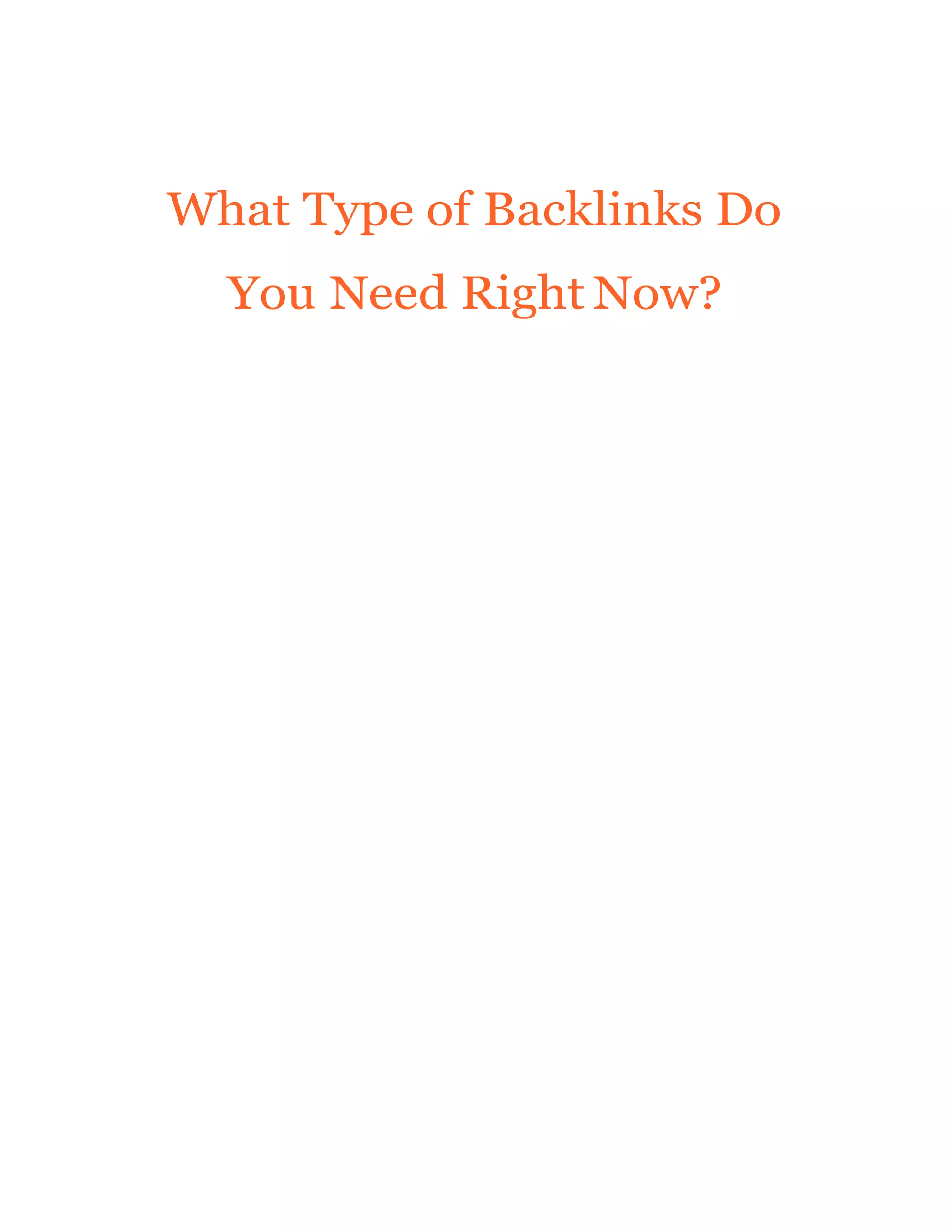 This document provides advice on different types of backlinks and backlinking strategies. It discusses four types of backlinks to avoid, including low-quality article directories, performing link exchanges at a large scale, thousands of automatically generated links from web 2.0 properties, and paid links that pass PageRank without a nofollow tag. It then outlines three circumstances to help determine appropriate backlinking opportunities based on website traffic levels and content quality. Finally, it provides email outreach templates for different backlinking techniques.