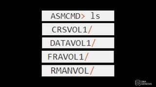This document discusses two ways to create directories within ASM disk groups in Oracle: using the ASMCMD utility or using SQLPlus connected to the ASM instance. It provides examples of using ASMCMD commands like mkdir to create directories within specific disk groups, and using SQL queries to create multiple directories at the same time within ASM.