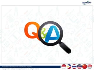 The document discusses challenges in e-education, emphasizing the importance of interactivity for enhancing learner engagement and motivation. It introduces Raptivity, an interactive tool that enables the creation of engaging learning content without programming, offering various deployment options. The presentation also highlights Raptivity's capabilities, including examples of interactive objects and the Raptivity Linker for creating short learning experiences.